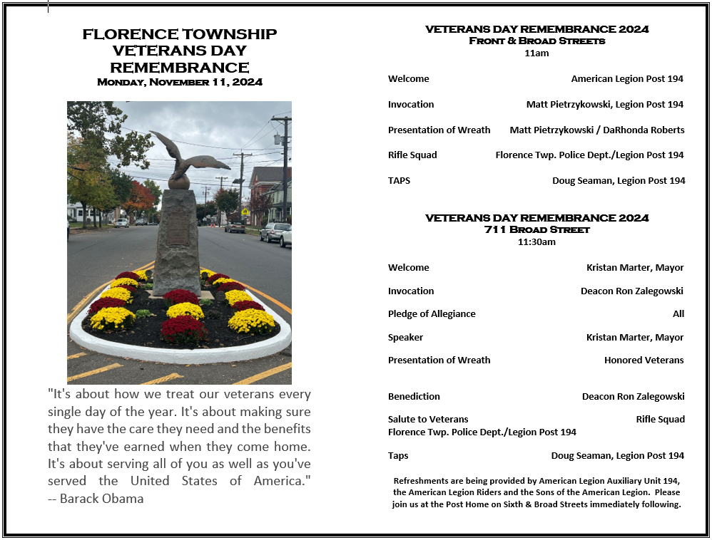 On Monday, November 11, 2024 representatives from American Legion Post 194 and American Legion Post 39 will conduct Veteran’s Day Observances at two locations in town. Please review the attached program for locations and times.