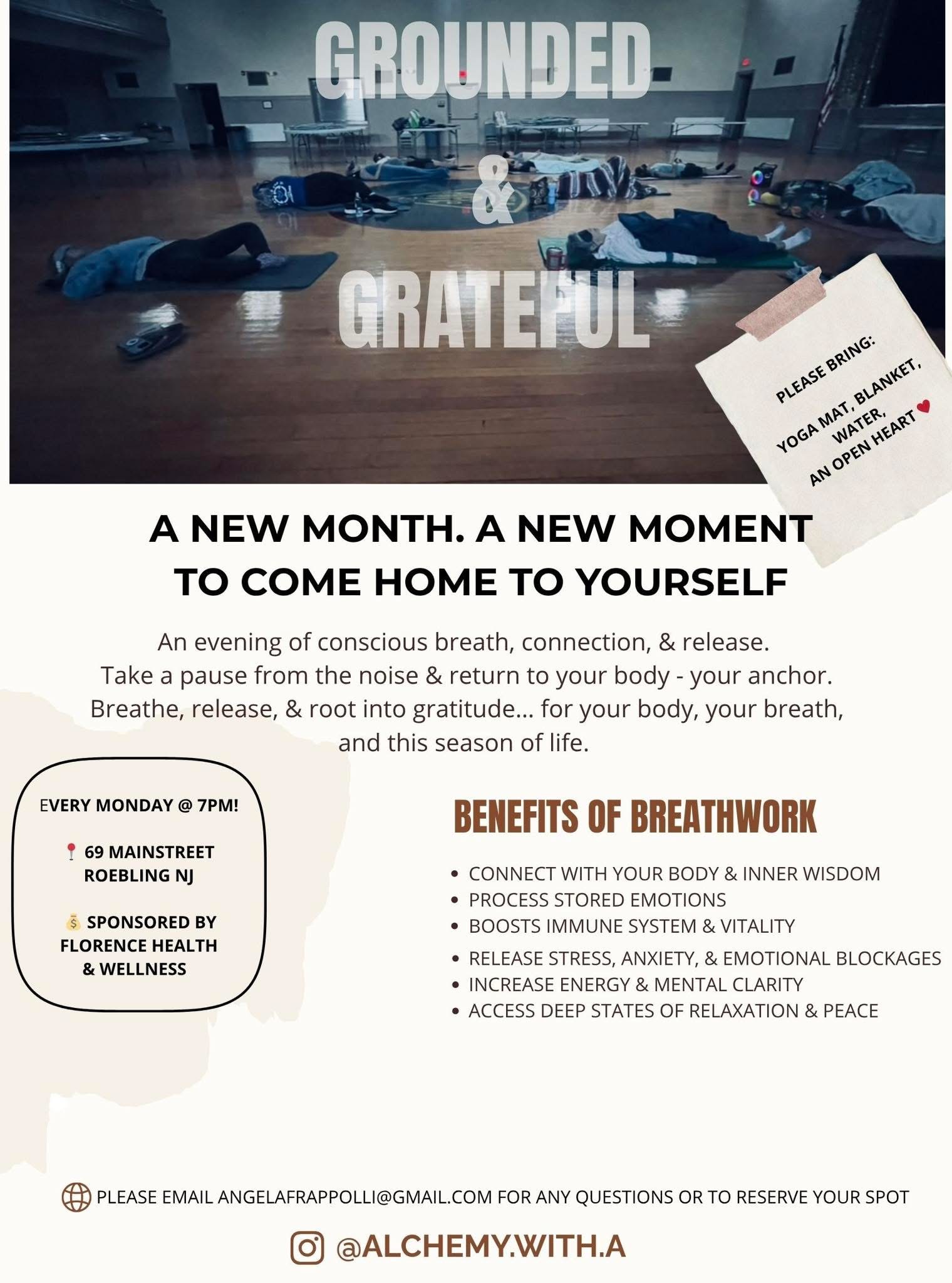 Breathwork Sessions Every Monday @ 7pm! 69 Mainstreet, Roebling, NJ + Add to Google Calendar + iCal / Outlook export 00 days 00 hours 00 minutes 00 seconds Date Jan 12 2026 Time 7:00 pm Category Community Events Exercise Master Calendar