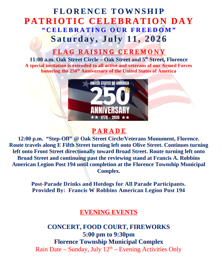 Starting at Noon, our township’s annual patriotic celebration parade kicks off with decorated cars, trucks & floats joining honored veterans, local organizations and dignitaries along the streets of Florence Township celebration a day of joy and appreciation as our country marks its 250th year. This year’s parade will follow the Florence Route traveling from Oak Street, along Olive & Front Streets beside the Delaware River, then turning up Broad Street towards our municipal complex.